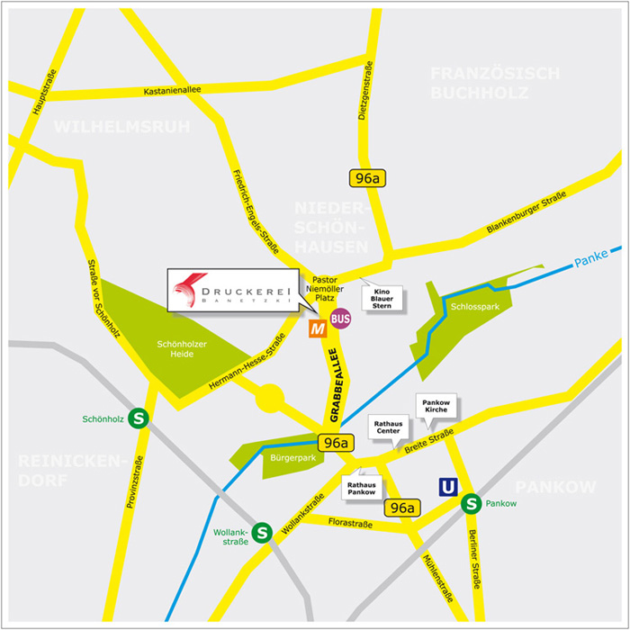 Anfahrt-Lageplan- Druckerei Banetzki- Grabbeallee 61, 13156 Berlin, Pankow-Niederschönhausen - Telefon: 030-42780905, Fax: 030-42780906, Email: banetzki@t-online.de - Unsere Bürozeiten Montag bis Donnerstag 10-18 Uhr Freitag 8-14 Uhr - Sie erreichen uns sehr gut mit der BVG. Kaum 50m von uns entfernt befindert sich eine Haltestelle Bus 150 und 250, MetroTram 1 |